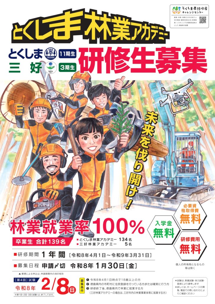 とくしま林業アカデミーでは次代の林業を担う研修生を募集しています。